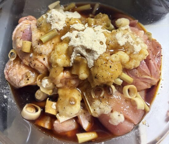 つけこみすぎると味が濃くなってしまうので、一晩を超えてしまう場合は①で鶏肉へのきりこみを浅くするかマリネ液から取り出しておくなどの工夫が必要です。