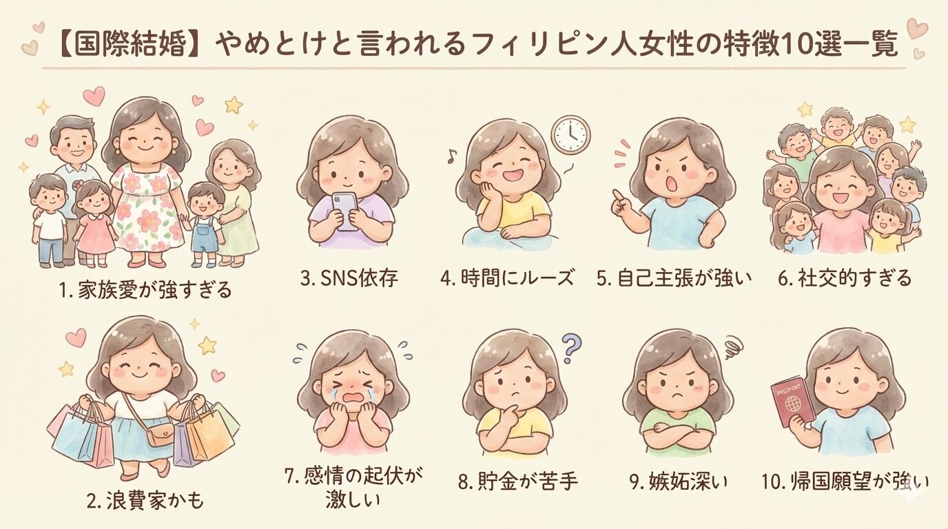 フィリピン人女性との国際結婚が「やめとけ」と言われる背景には、性格の良し悪しではなく、金銭感覚・家族観・感情表現・話し合いのスタイルといった価値観の大きな違いがあります。